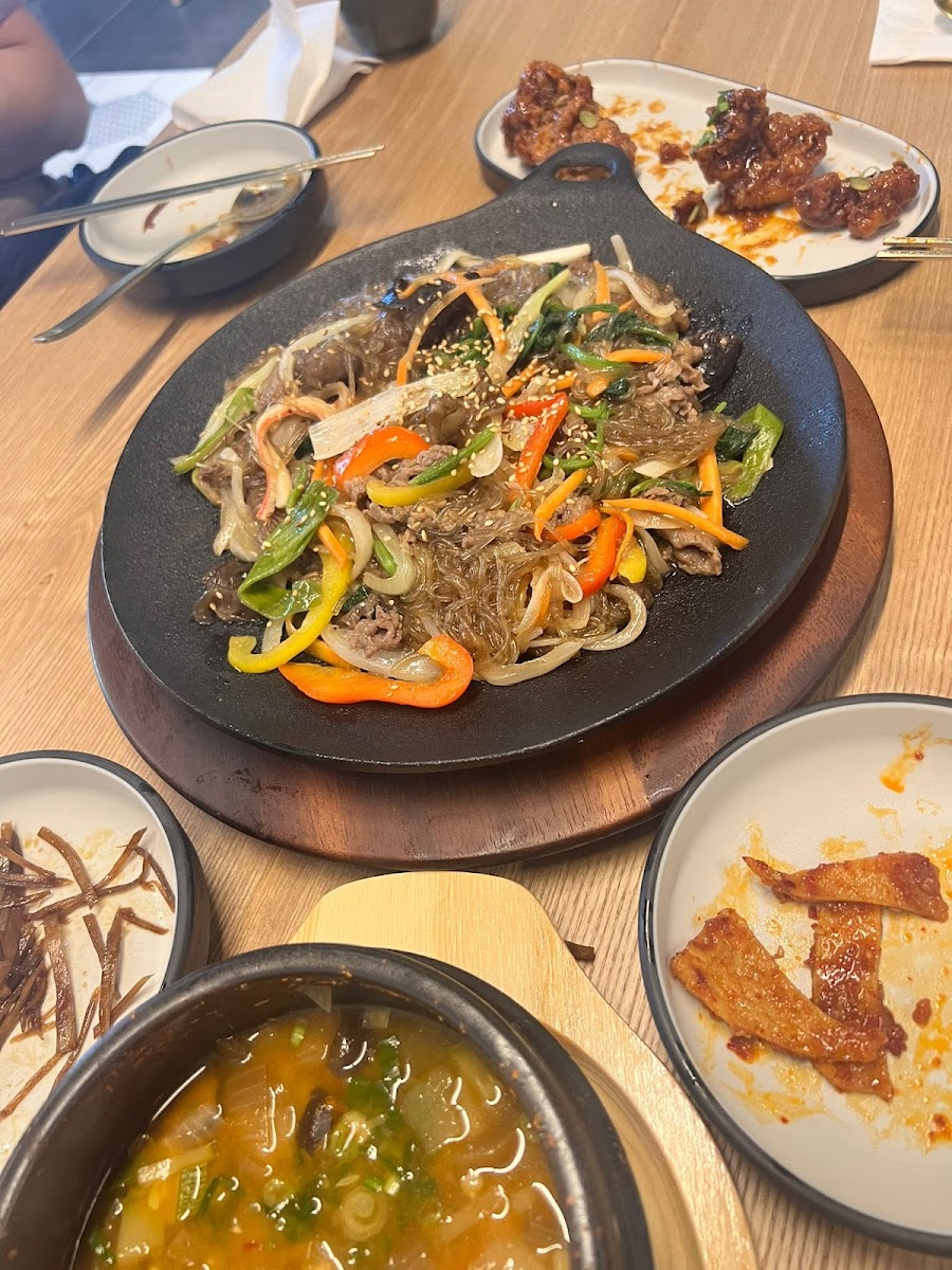 For those who enjoy a more delicate, savory dish, the Japchae is a must-try. This stir-fried glass noodle dish is cooked with vegetables and your choice of beef, chicken, or tofu. It’s a flavorful and satisfying dish that highlights the essence of Korean cooking. Another comforting choice on the menu is the Soft Tofu Soup, a warm and nourishing option for those seeking something light yet flavorful. The tofu, soft and creamy, pairs perfectly with a spicy broth that will warm you up from the inside out.