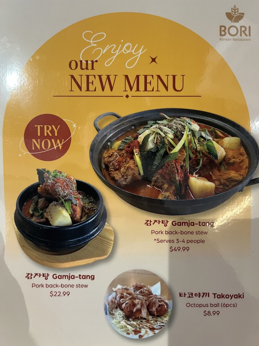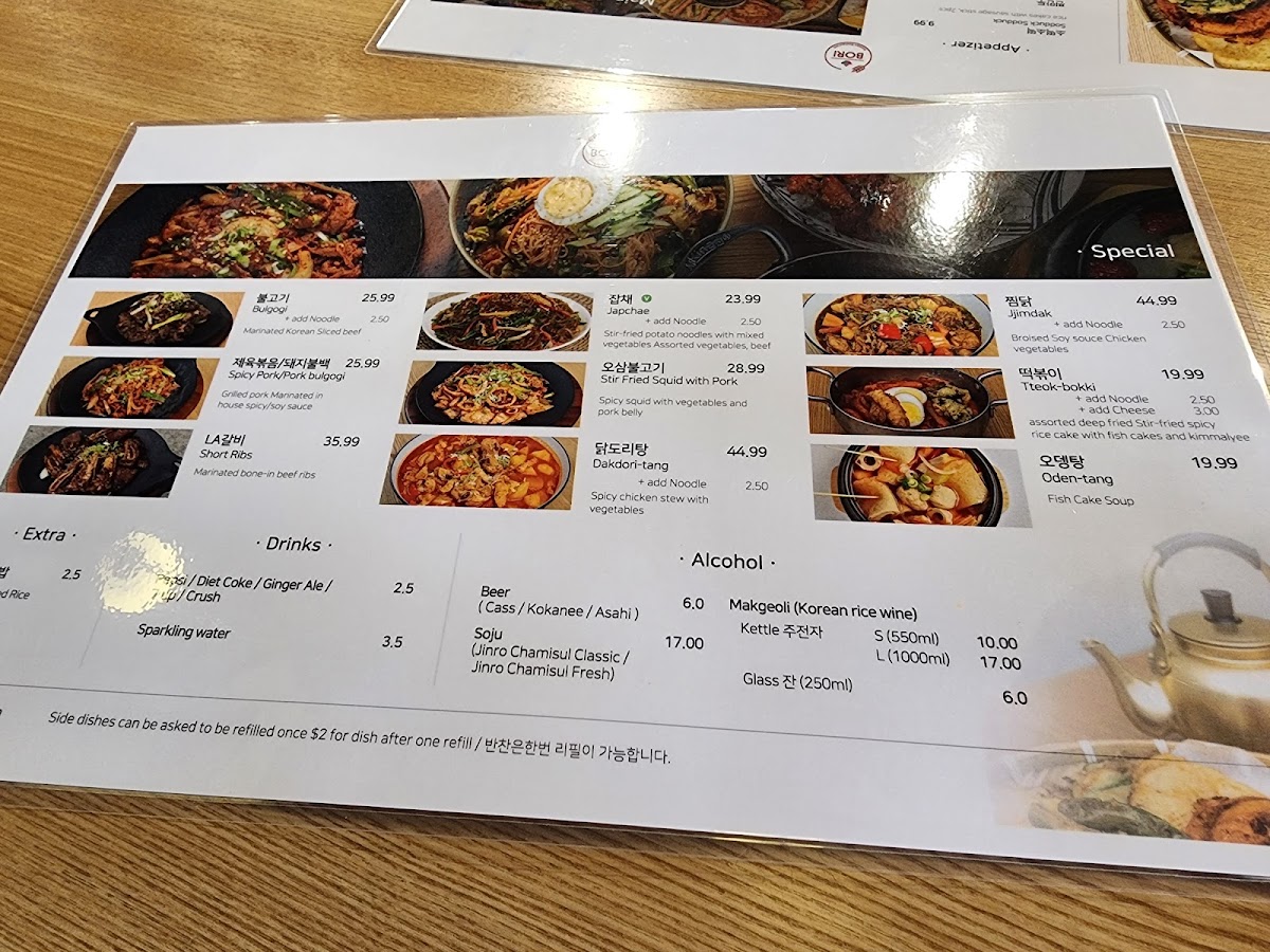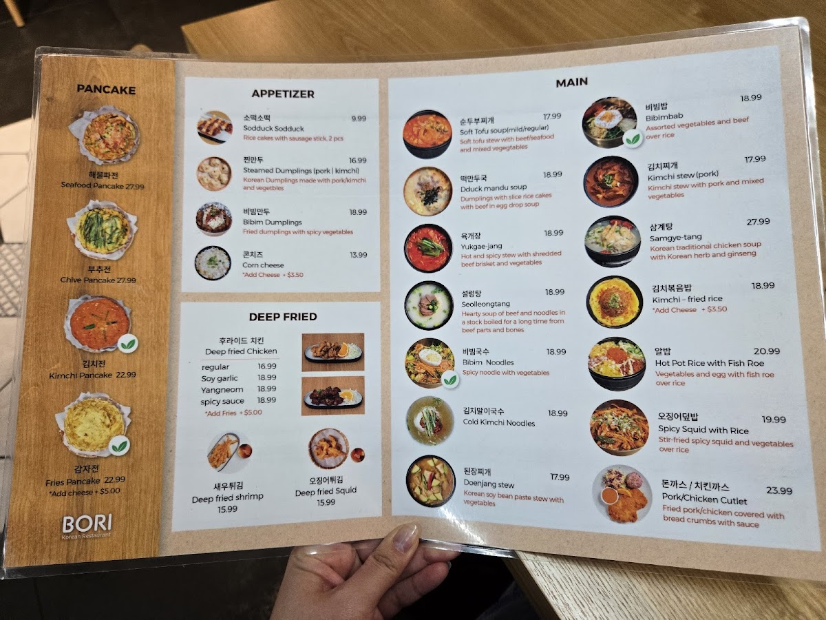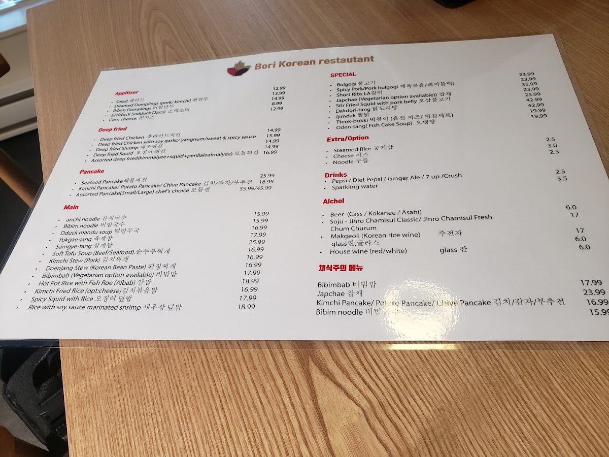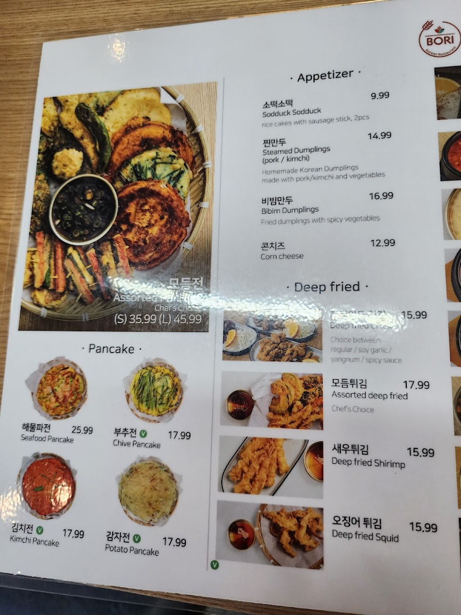 From a reviewer’s perspective, the menu at Bori Korean Restaurant offers a well-rounded and comforting snapshot of Korean cuisine, balancing familiar favorites with hearty specialties. Starting with appetizers, items like Deep Fired Dumplings, Sodduck Sodduck (2 Pieces), Steamed Dumplings, Corn Cheese, and Takoyaki are ideal for sharing and set the tone with rich flavors and satisfying textures. The drink selection complements the food nicely, ranging from alcoholic options such as ASAHI Beer 2L, Beer, Soju - Jinro Chamisul Fresh, and Sparkling Soju, to non-alcoholic POP drinks like 7 Up, Ginger Ale, Sparkling Water, Pepsi, and Diet Pepsi, making the menu accessible to all types of diners.