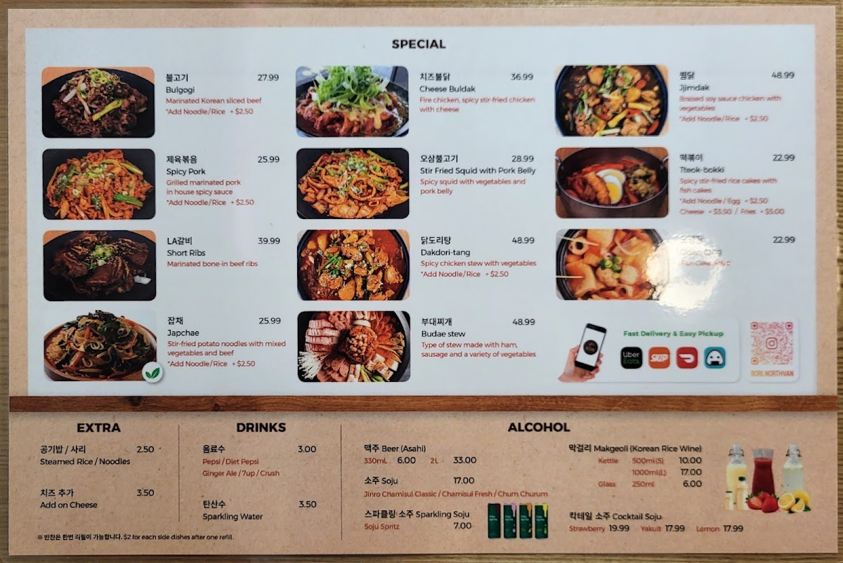 Fans of crispy textures will appreciate the deep-fried selections like Deep-Fried Chicken, Deep-Fried Shrimp, and Deep-Fried Squid, while the specials elevate the experience with more indulgent and shareable plates such as Gamjatang Hotpot, Cheese Buldak, Tteok-Bokki, Dakdori-Tang, and Bulgogi. To round everything out, extras like Radish 1L, Steamed Rice, and Kimchi 1L allow diners to customize their meals, and the pancake section-featuring Chive Pancake, Kimchi Pancake, Seafood Pancake, and Potato Pancake-adds another layer of variety. Overall, the menu feels complete, approachable, and deeply rooted in Korean dining culture, making it easy to see why it appeals to both first-time visitors and returning guests.
